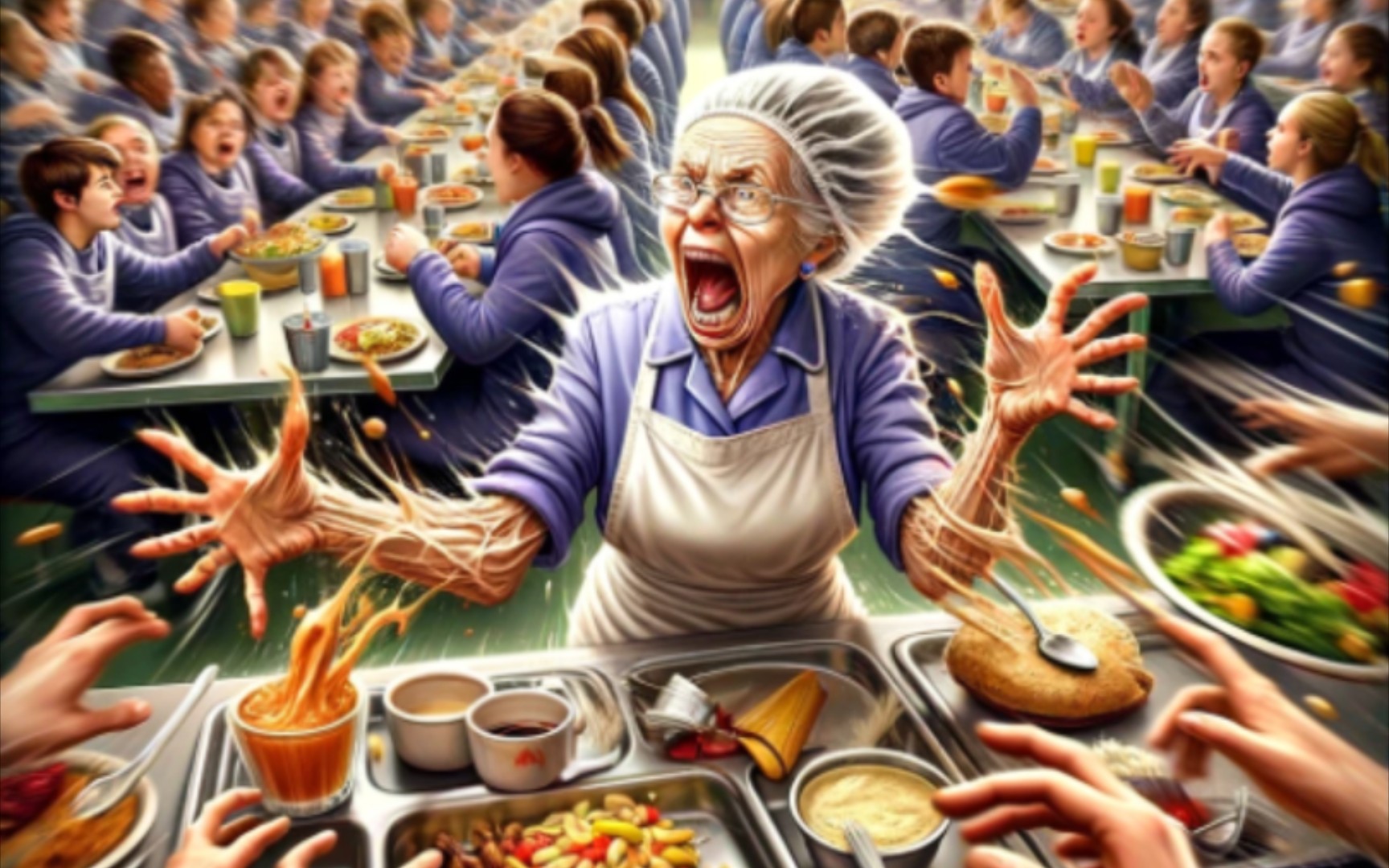 用gpt画一个给学生盛菜的食堂阿姨,但手越来越抖,最后…