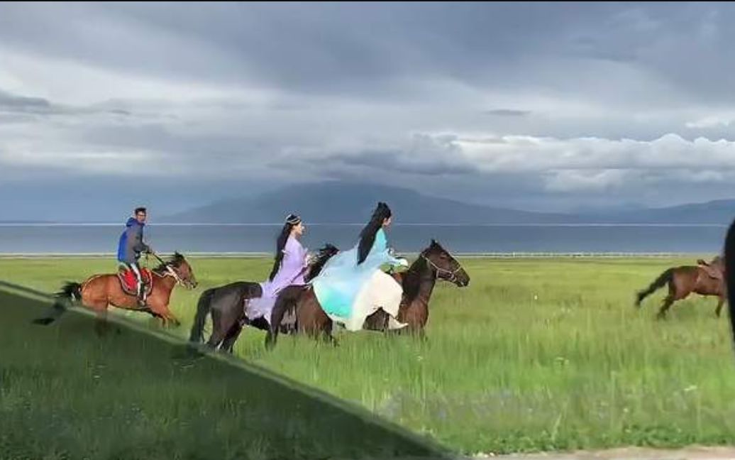 经典再现!车友驾车经过赛里木湖,被穿古装的骑马小姐姐惊艳到