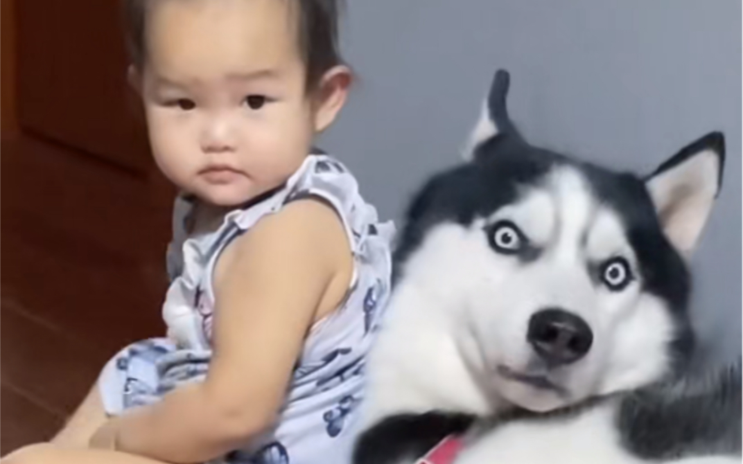 当9个月的人类幼崽看到二哈睡在床上(库存)