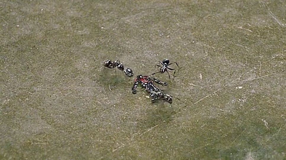 男人好像在地上看见了什么东西,于是他仔细查看,居然看见几只蚂蚁抬来了一件纳米战衣
