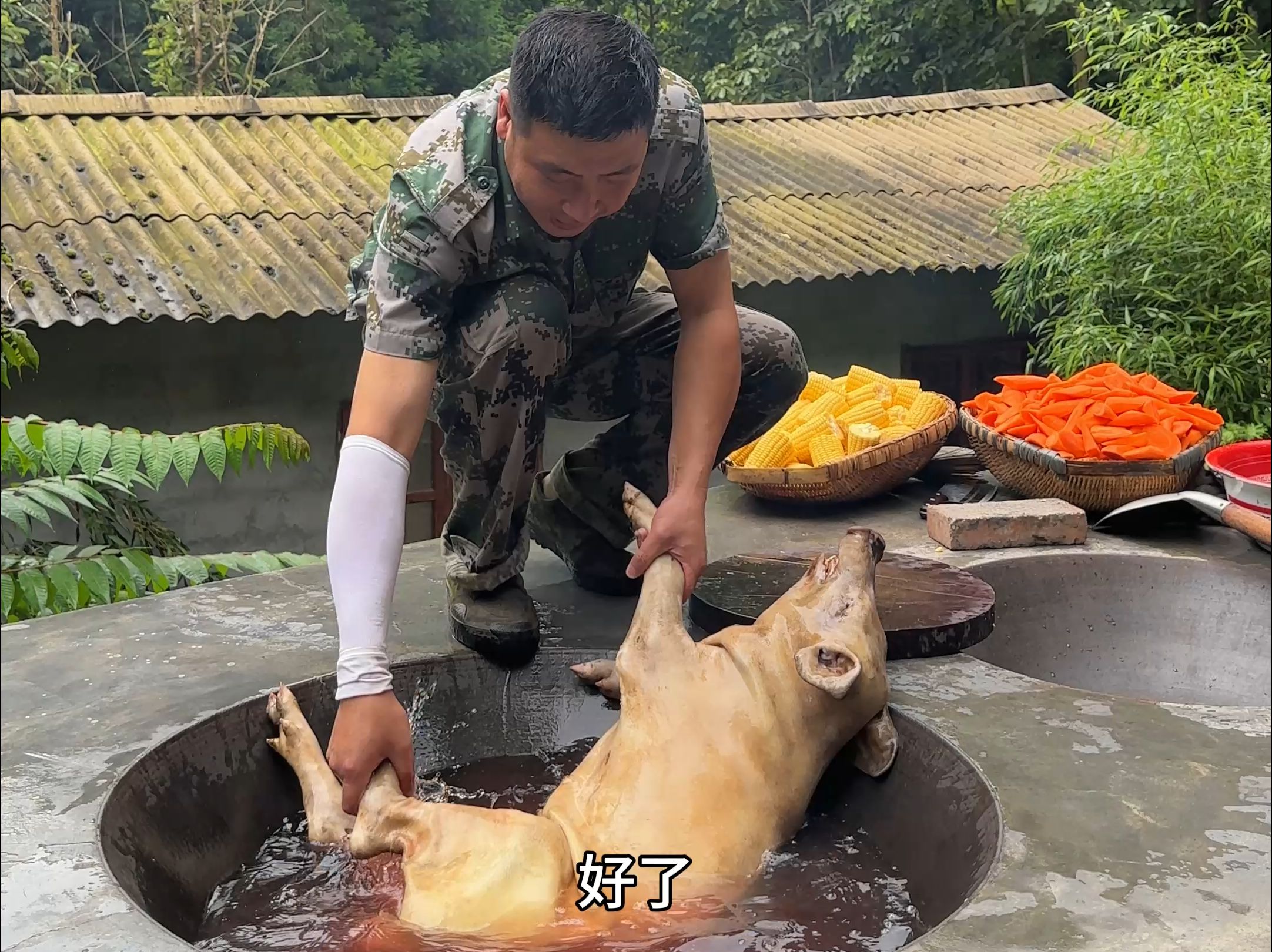 前几天猪掉到河里。幸好养牛的叔叔和阿姨看见了帮把猪给拉起来,挽回了损失。大家在山里养殖就是这样互帮互助。表示感谢,今天做的丰盛点,加叔叔阿姨一起吃饭。
