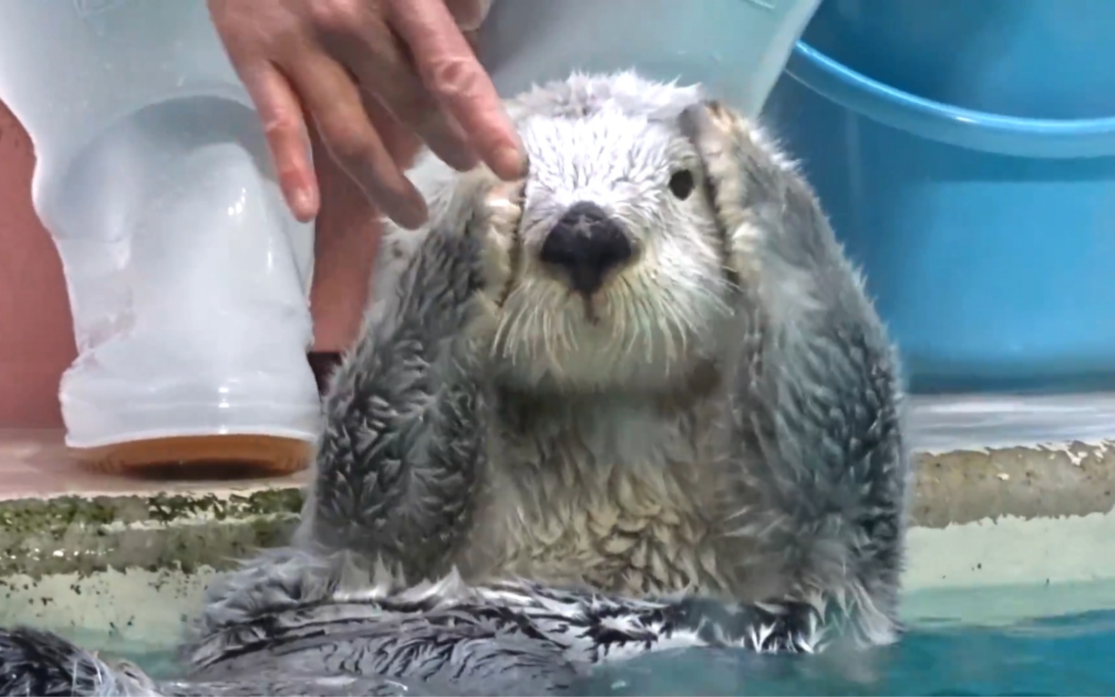 被救助的水獭宝宝Luna很怕水,于是工作人员开始训练它
