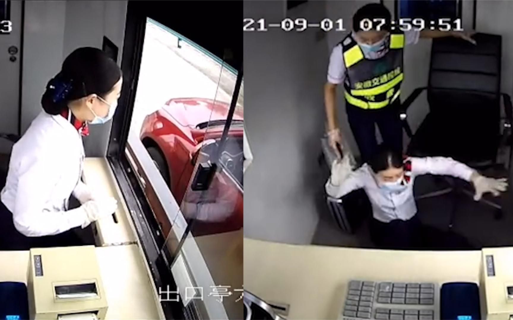 收费员交接班时,摔了屁股蹲不见踪影笑翻网友:“哐当”就不见了