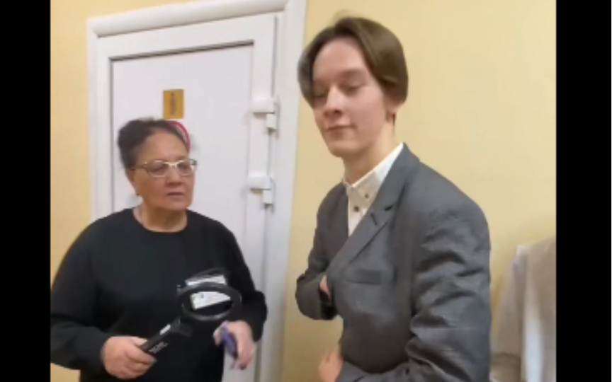 俄罗斯男孩穿着裙子从学校回家
