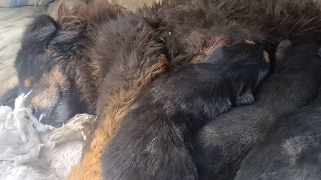矿山上的流浪藏獒。小狗长牙了,吃奶的时候