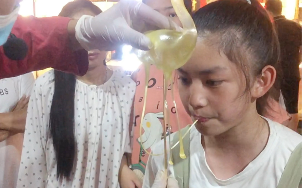 国外的小朋友第一次体验中国非遗吹糖人,感到很惊呀,暴赞