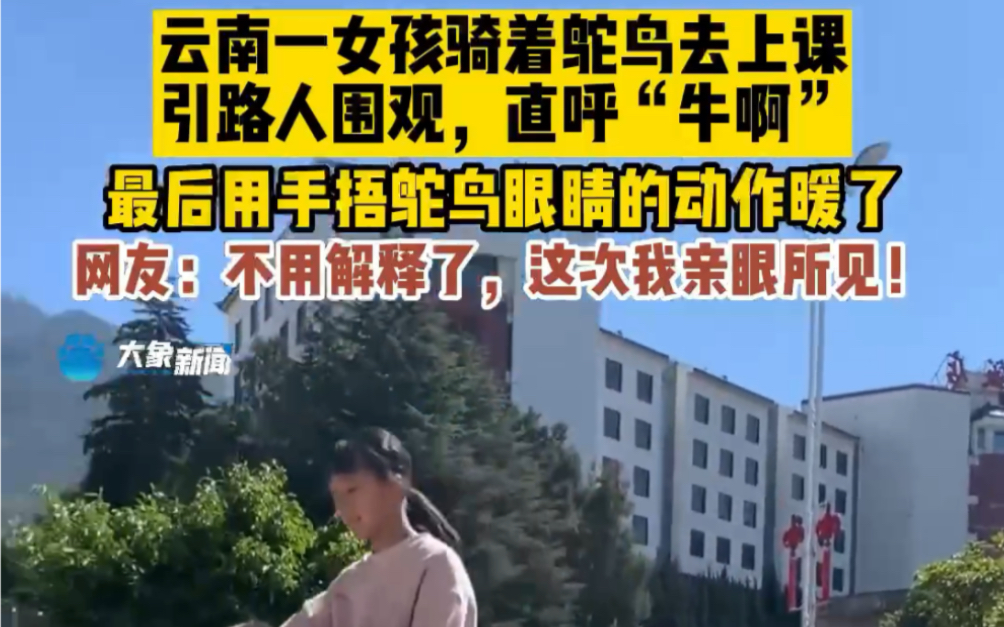 2月3日云南大理,“云南别解释了,这次亲眼所见!”云南一女孩骑着鸵鸟去上课,引路人围观,直呼“牛啊”最后用手捂鸵鸟眼睛的动作暖了#云南 #路人视角