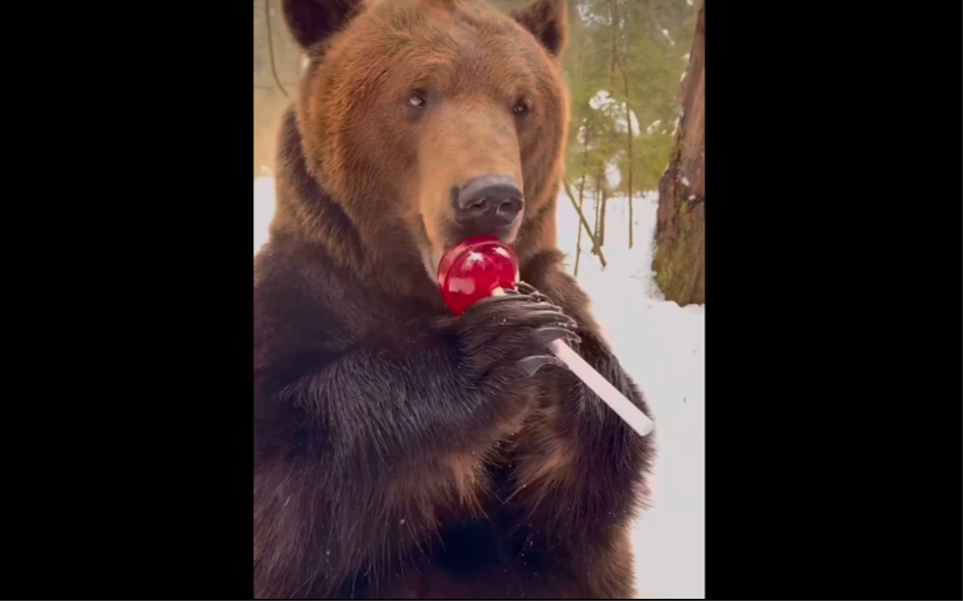 惊呆了😮!俄罗斯糖果公司为家养熊量身定制的巨型草莓味棒棒糖,太有爱了吧💖!