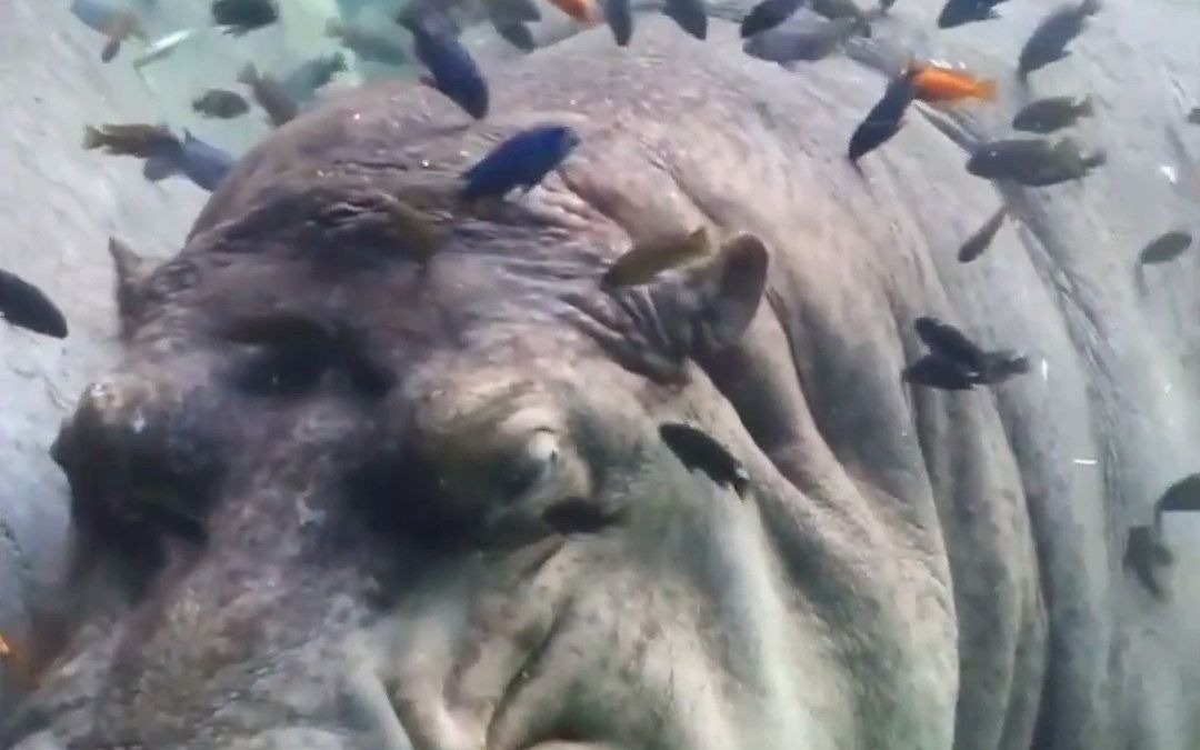 圣安东尼奥动物园里,尼罗河河马Timothy打着盹,享受着全身“鱼疗”