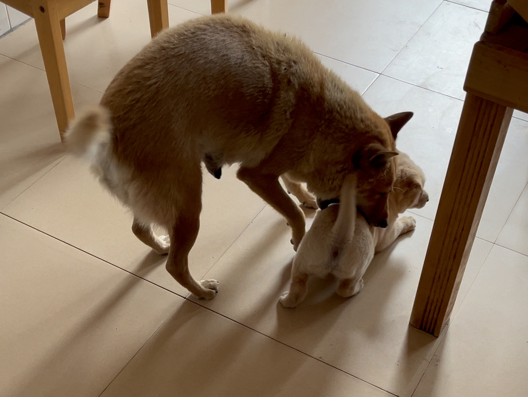小狗狗真好玩,玩哭了就赶紧还给它妈妈,它妈妈趴下给它喂奶,它就不叫了。