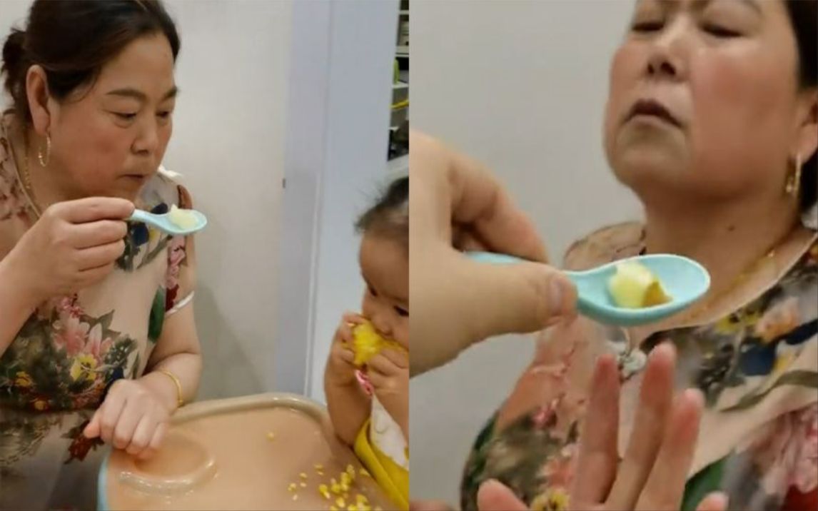 婆婆喜欢嘴里吐饭喂给孙女,儿媳夺下勺子原样反击,婆婆反应高能