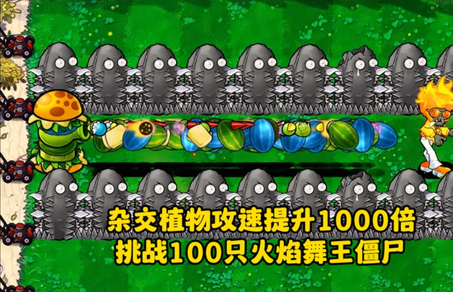杂交植物攻速提升1000倍,挑战100只火焰舞王僵尸。