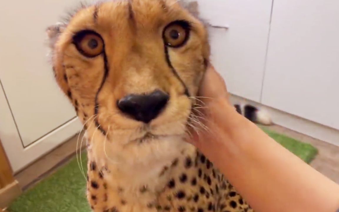 当猎豹被抚摸耳朵,它深情地望着妈妈