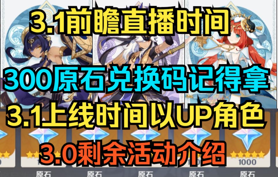 【原神】3.1前瞻直播300原石兑换码!3.1上线时间与角色卡池!3.0剩余活动介绍!