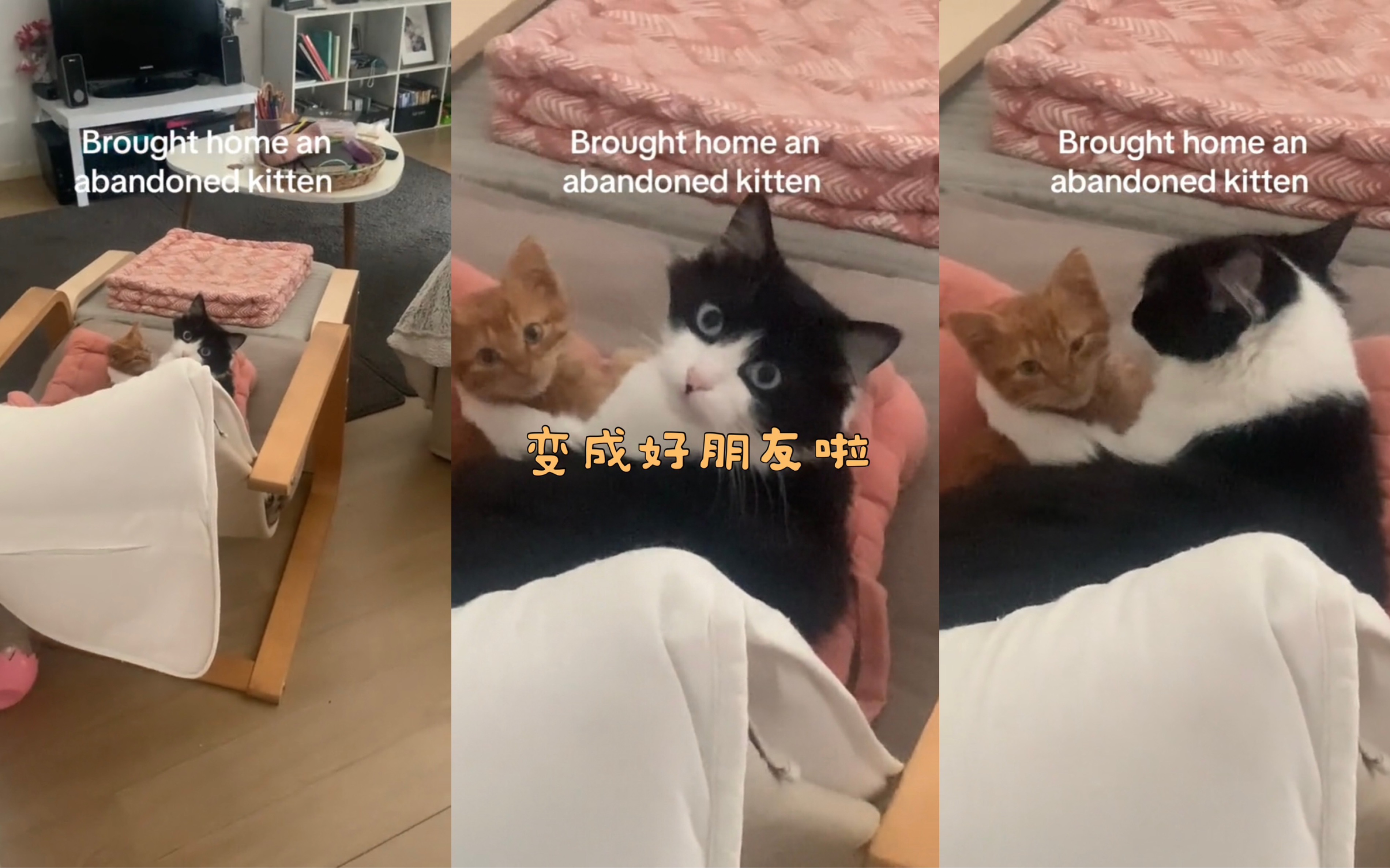最暖心的金毛木木,猫咪小七吃饭,就静静的看着