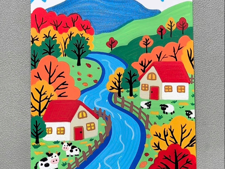 丙烯马克笔画《秋天》风景,一看就会。#丙烯马克笔风景画 #秋天主题画 #儿童画 #创意美术