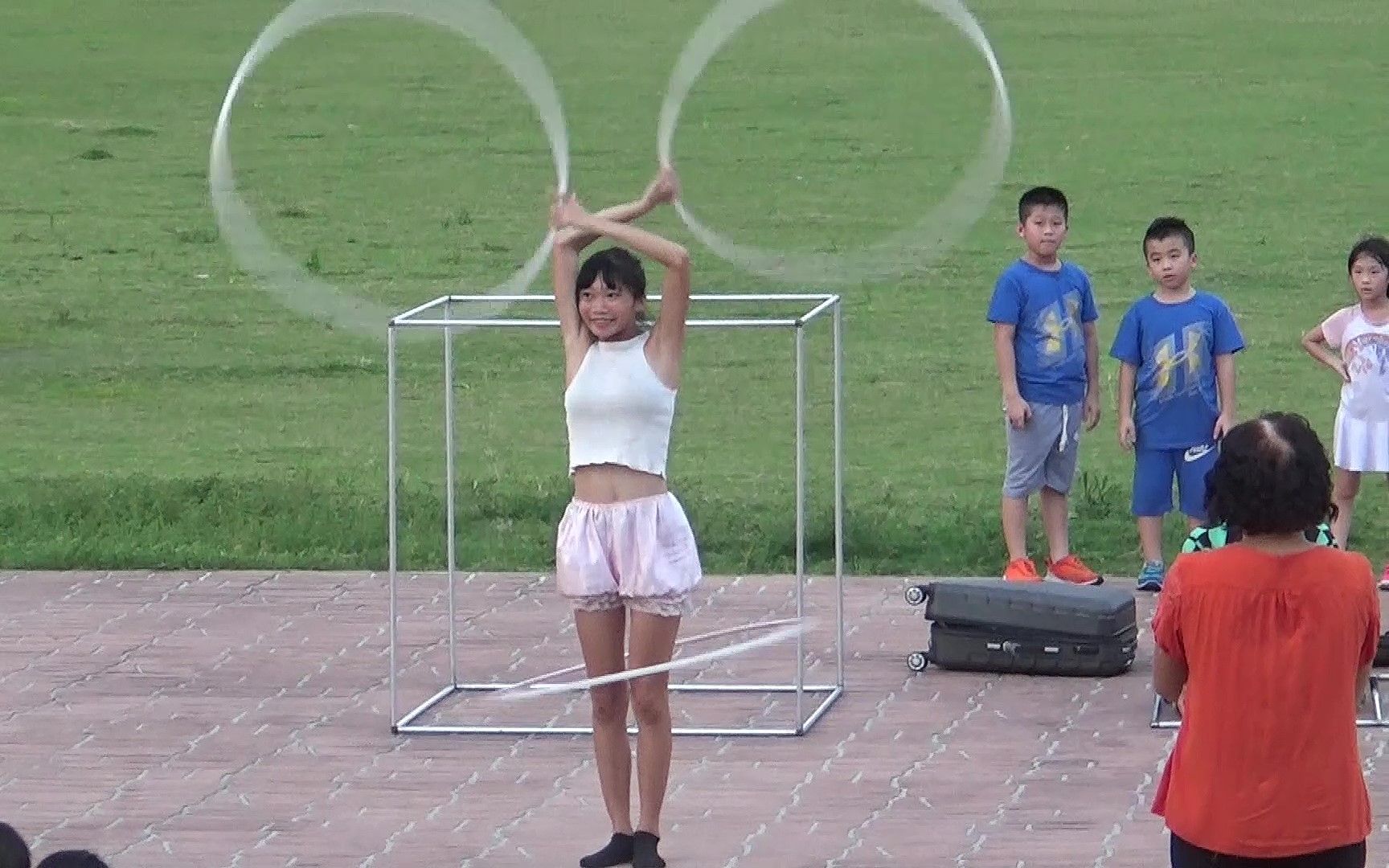 女孩在街头卖艺 生锈的呼啦圈 卖力的摇出下一餐