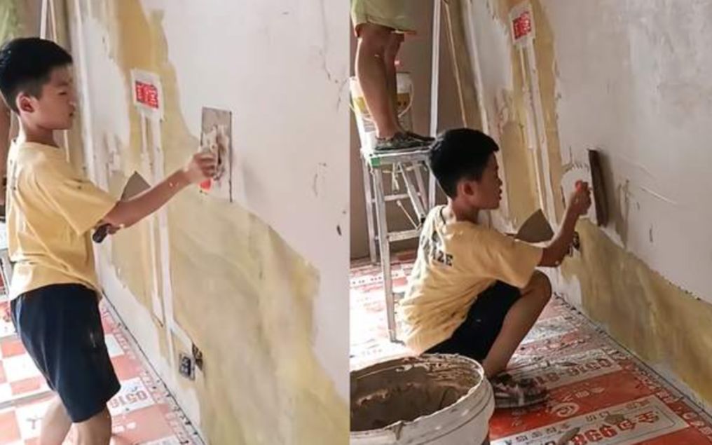 男孩被父母带工地体验生活,谁知男孩刮腻子上瘾:教育台词全没用
