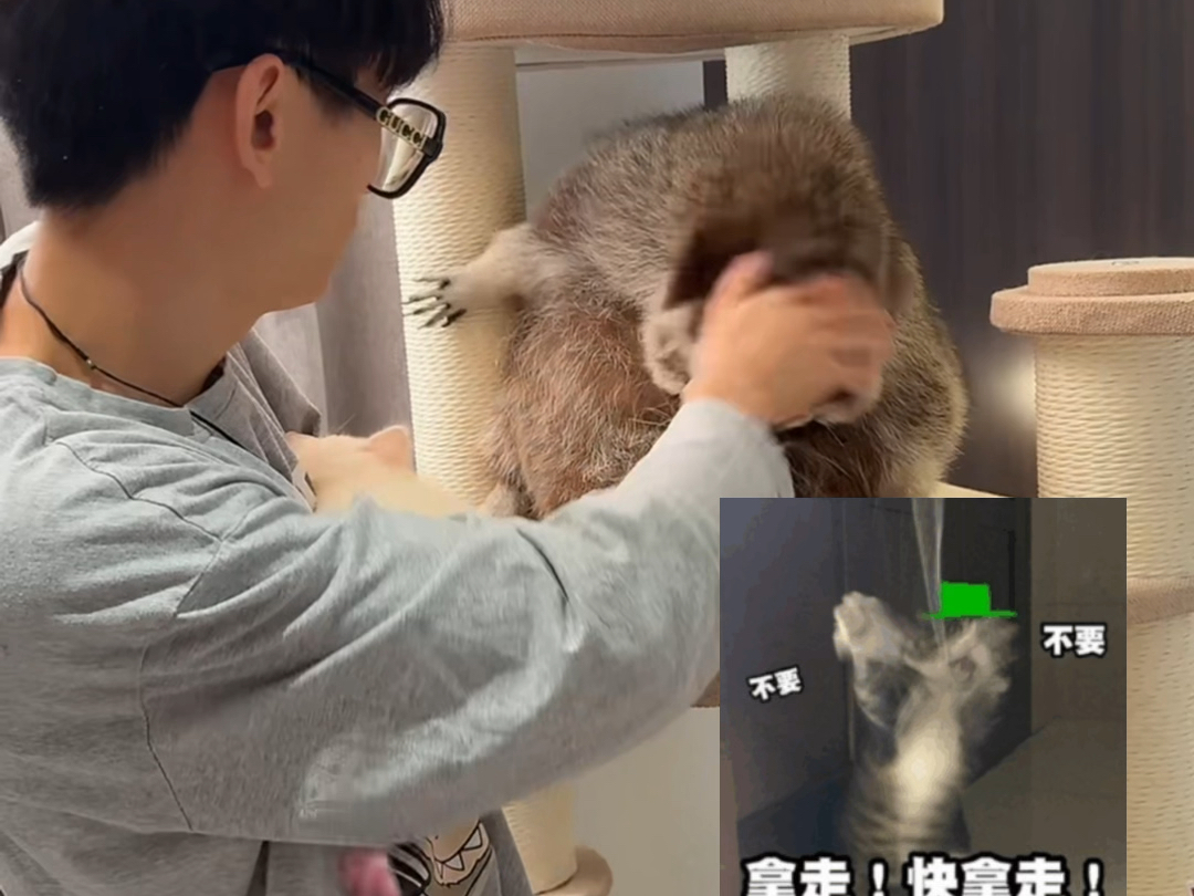 小猫过年吃太好,无法钻管道回家,主人在一旁乐开了花