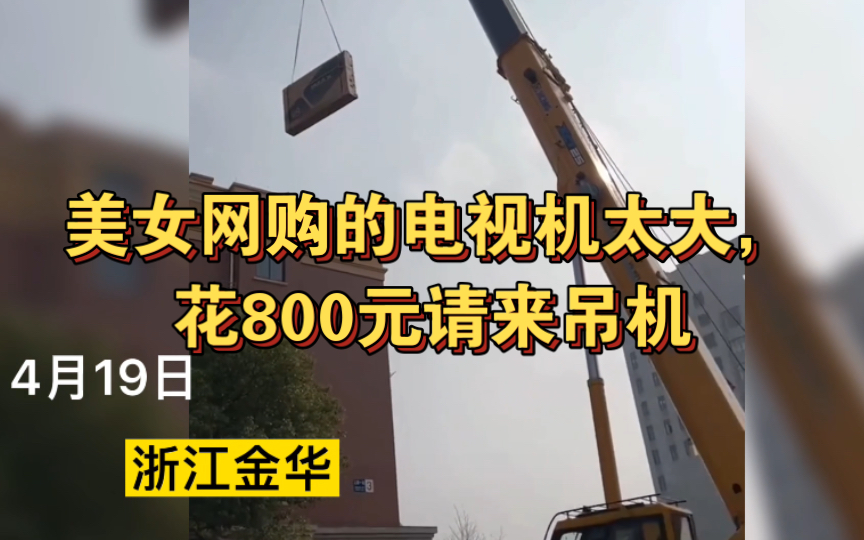 美女网购的电视机太大,花800元请来吊机,网友酸了:坏了咋下来