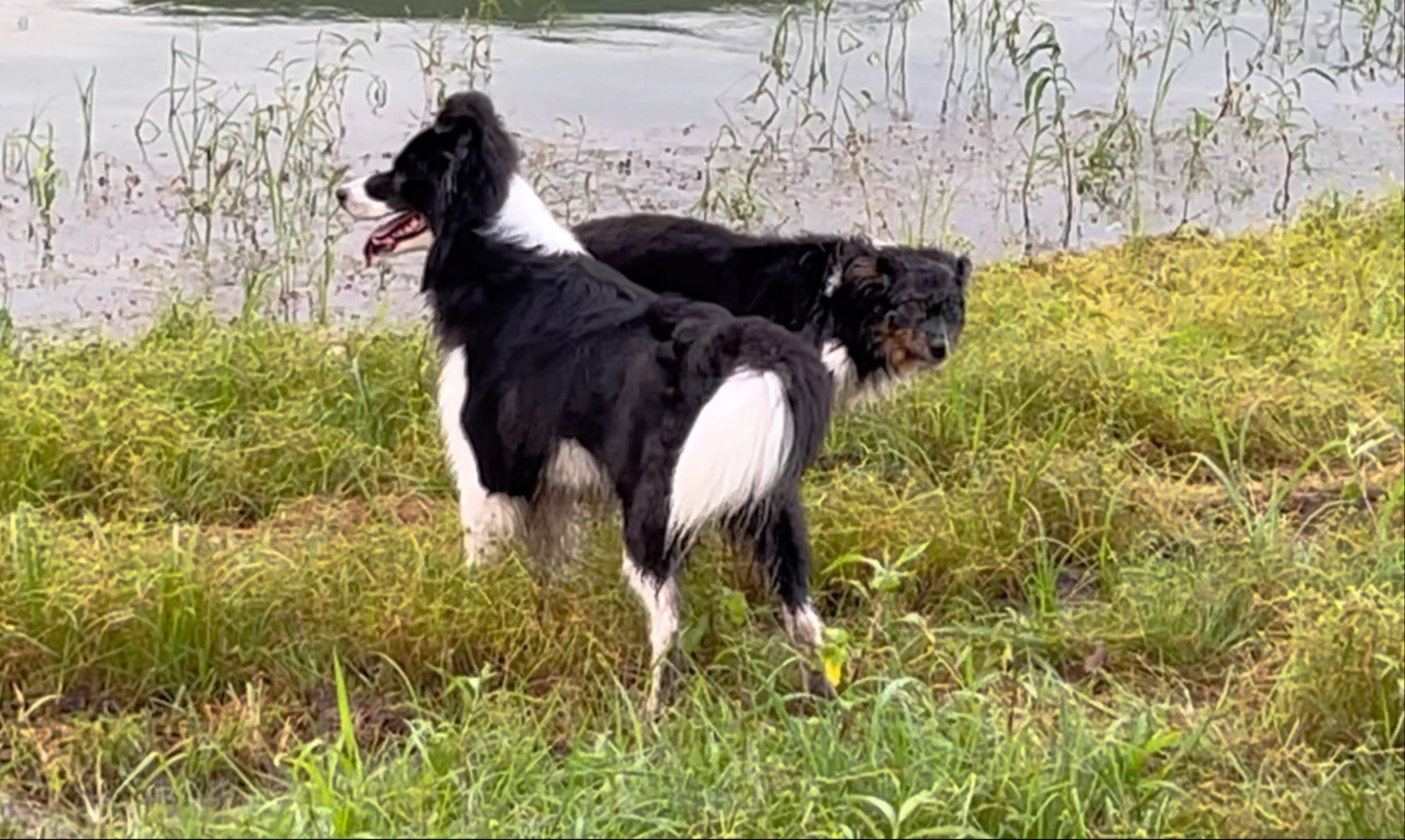 西米露喜欢玩水,西卡不喜欢玩水,但是当我站在水里的时候西卡还是会到我身边去看一看